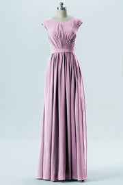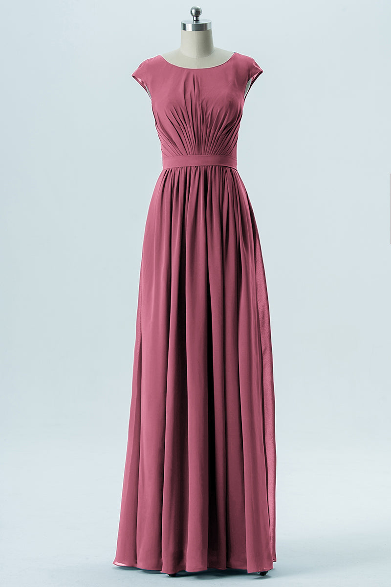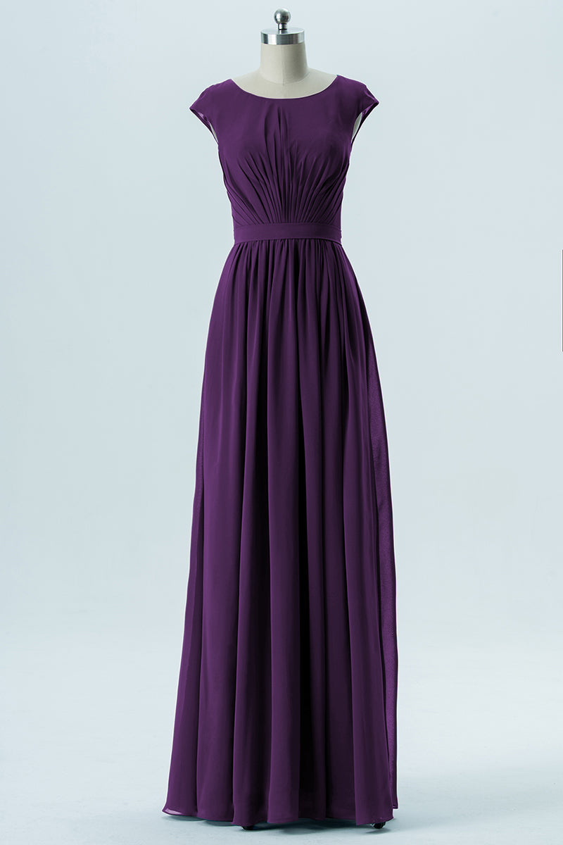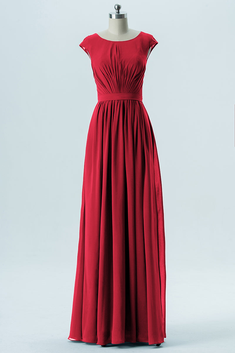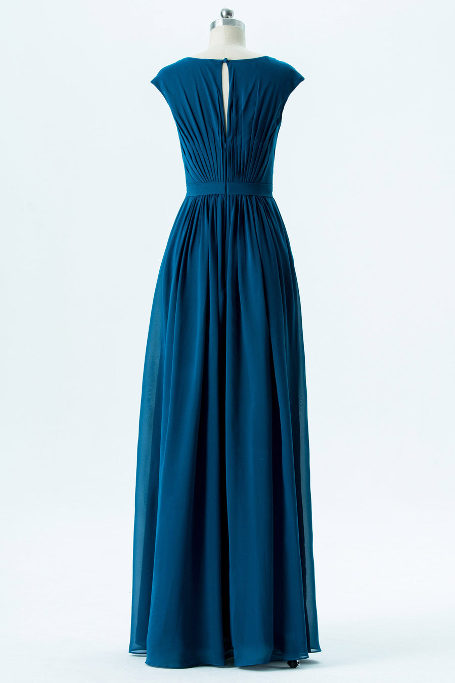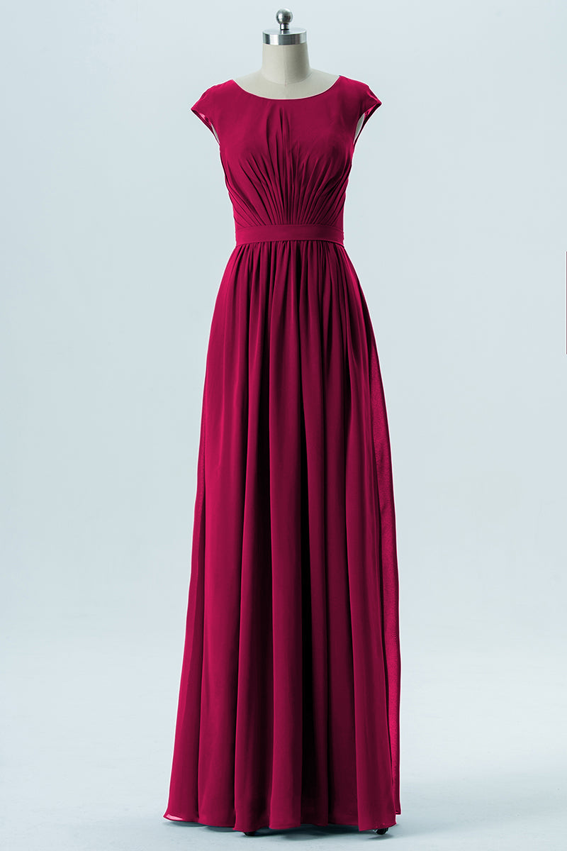 Chiffon Column Scoop Neck Cap Sleeves Bridesmaid Dress-B13652